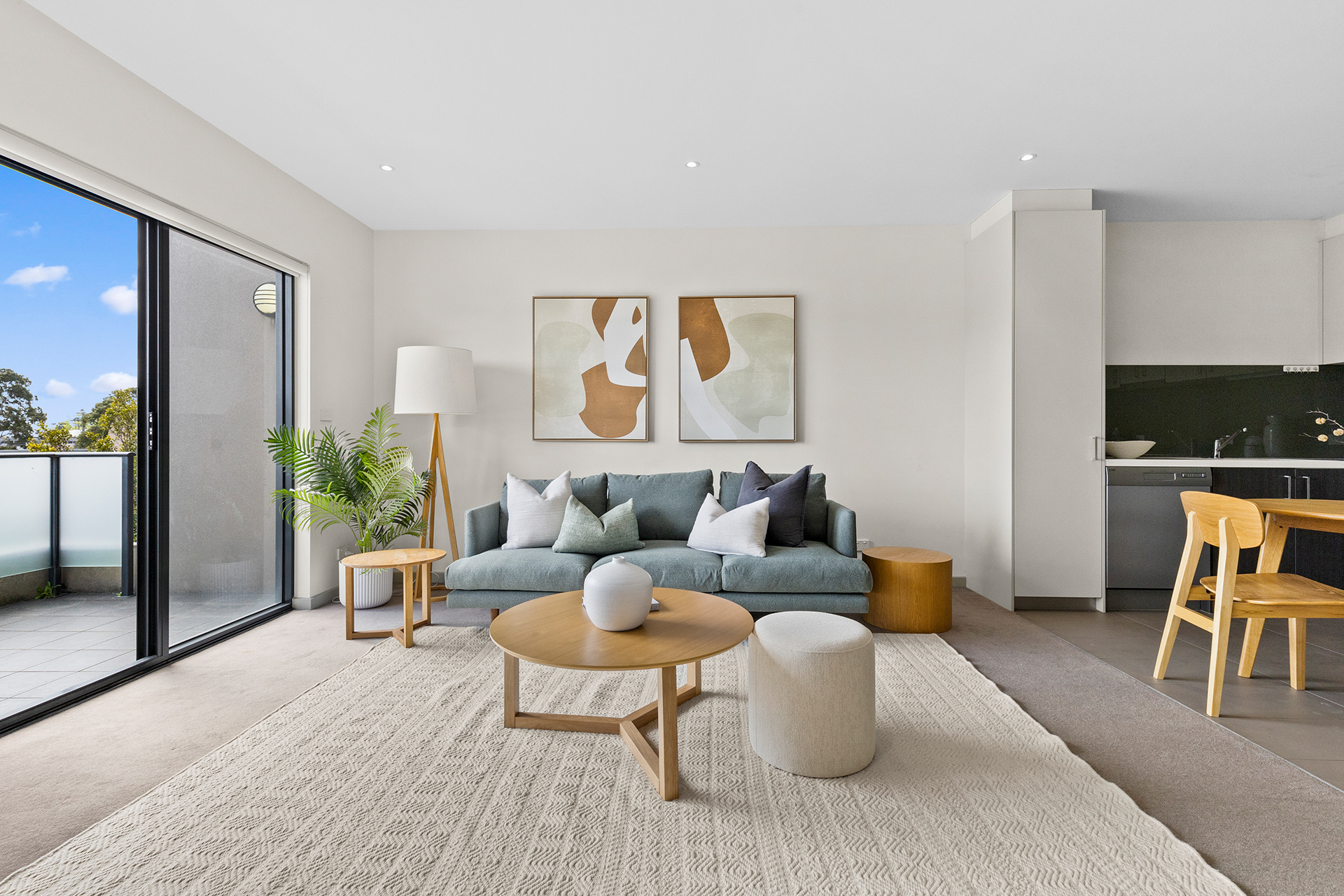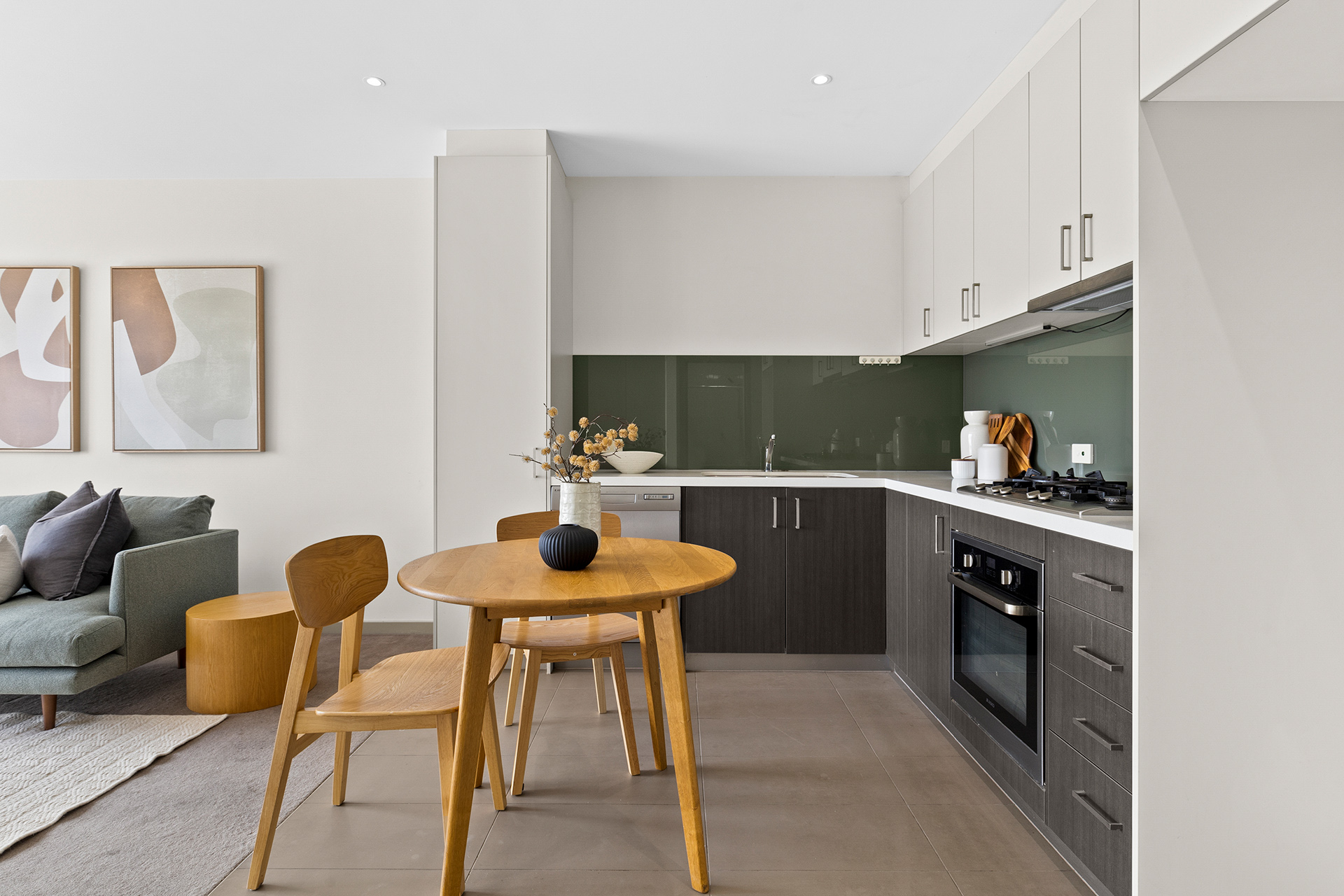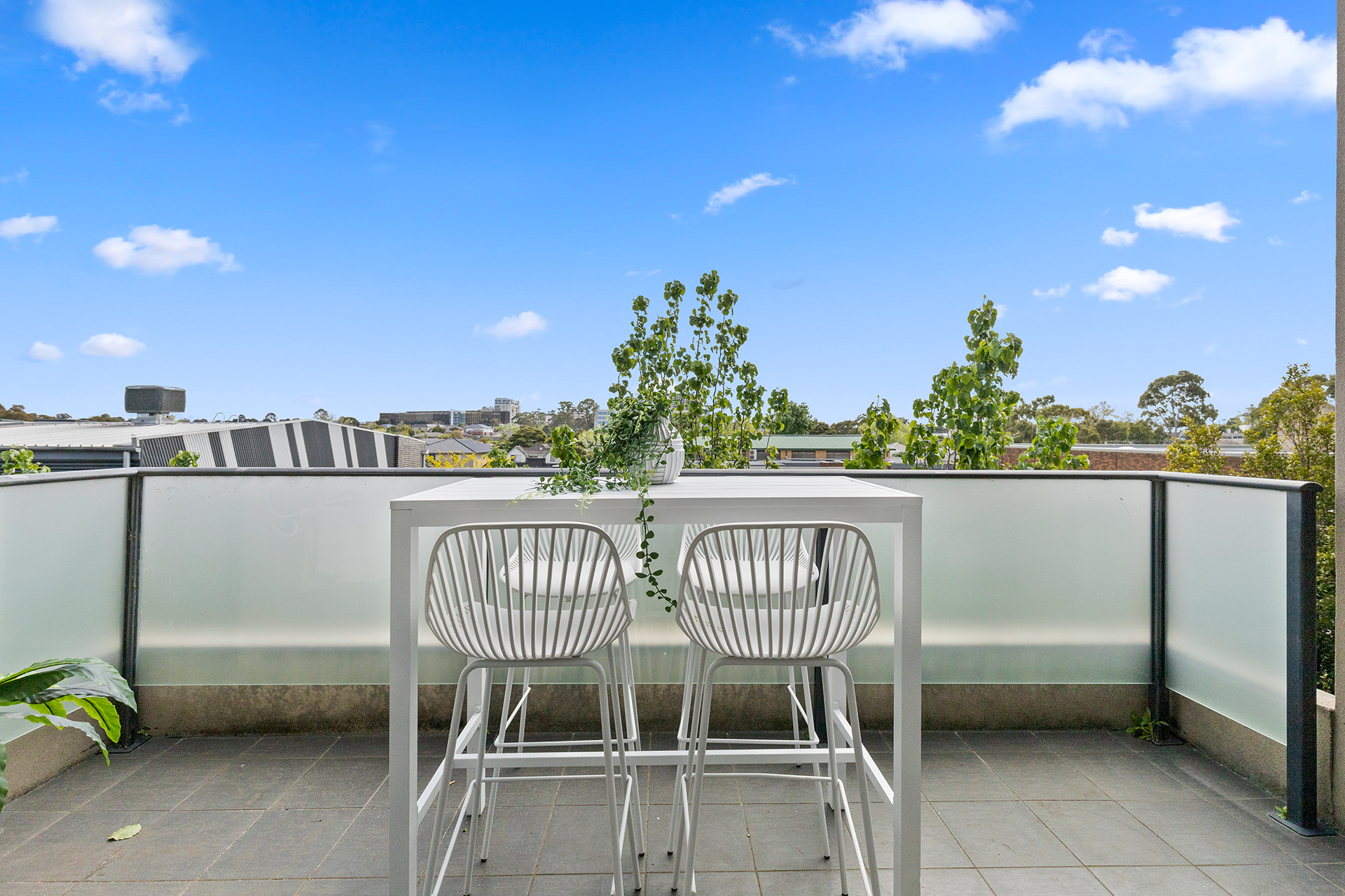 Beautifully designed to maximise space and light, the open-plan living and dining area flows seamlessly to a north-facing balcony that overlooks the treetops — the perfect place to unwind or entertain in privacy. The modern stone-topped kitchen is equipped with premium stainless-steel appliances, generous storage, and sleek finishes throughout.