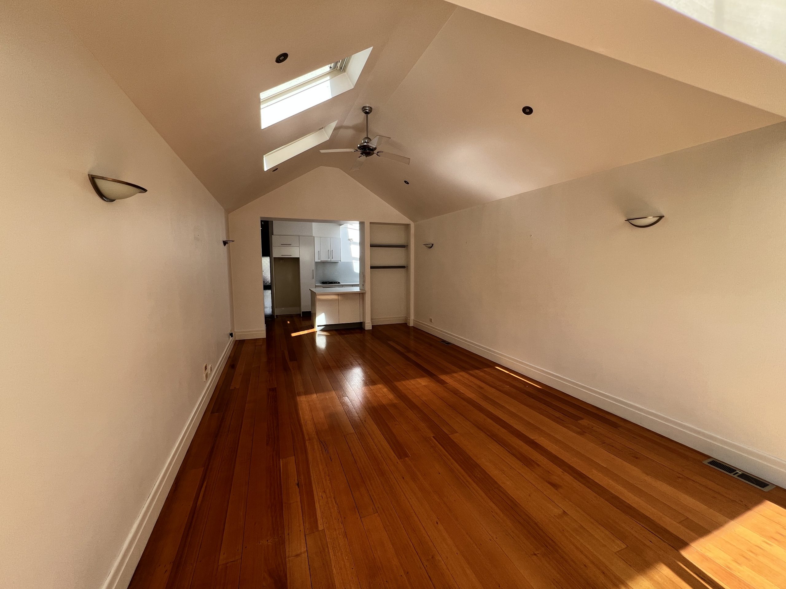 The rear extension impresses with soaring vaulted ceilings, a sleek contemporary kitchen, and expansive glazing that opens to a private courtyard with deck and convenient rear laneway access — ideal for entertaining or relaxing in peace.