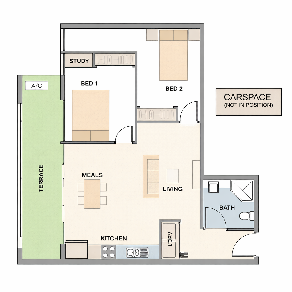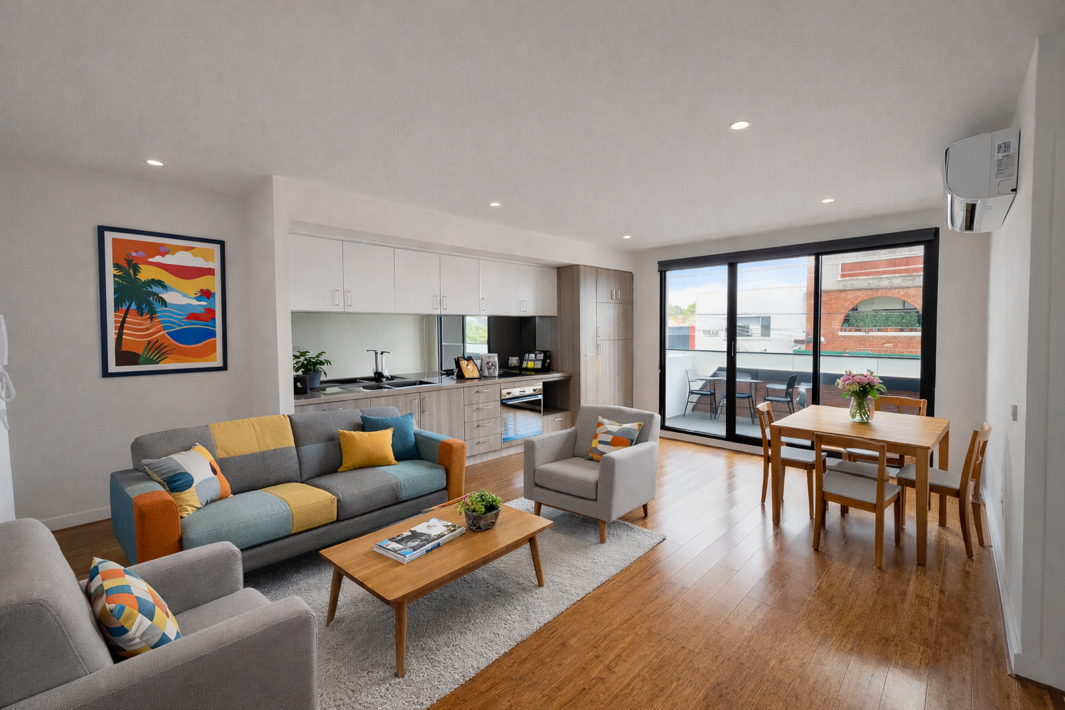 The standout and hero is the exceptionally spacious balcony, ideal for entertaining, relaxing or simply watching village life unfold below. Flowing directly from the open-plan living area, it’s a rare feature that truly sets this home apart. Inside offers two genuine bedrooms with robes, a modern kitchen and a light-filled layout designed for easy living.