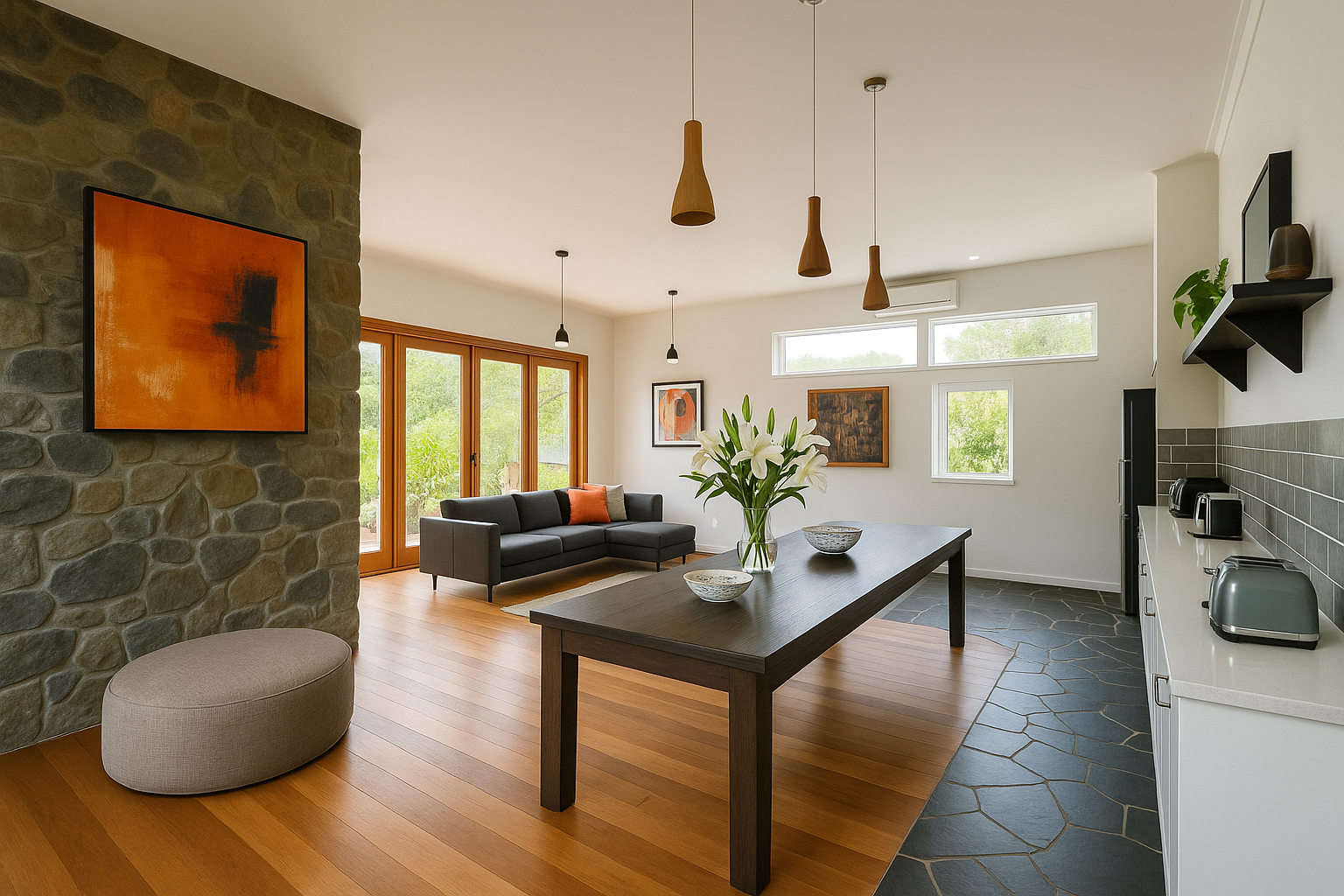 The rear opens into a cavernous contemporary living and entertaining zone, designed to allow multiple defined living/dining configurations. A sleek modern kitchen anchors the space, while glass bi-fold doors spill out onto an elevated timber deck—perfect for alfresco dining and overlooking the deep back garden on its expansive 697m² allotment.