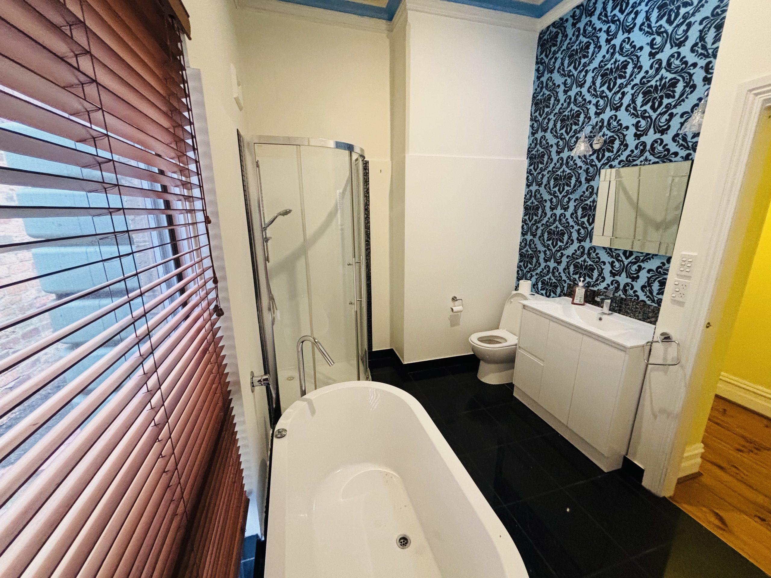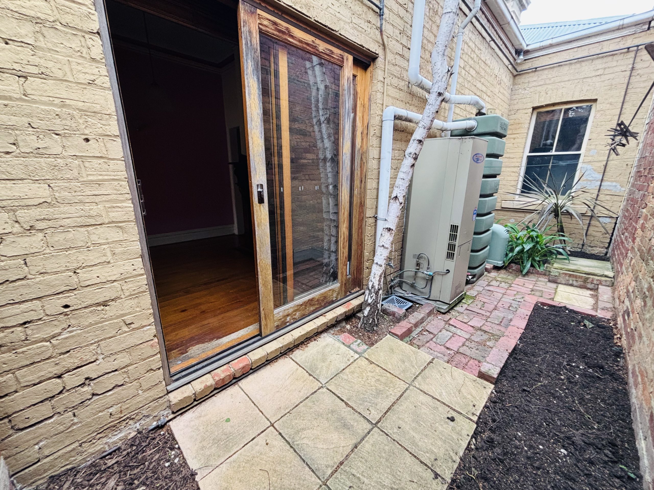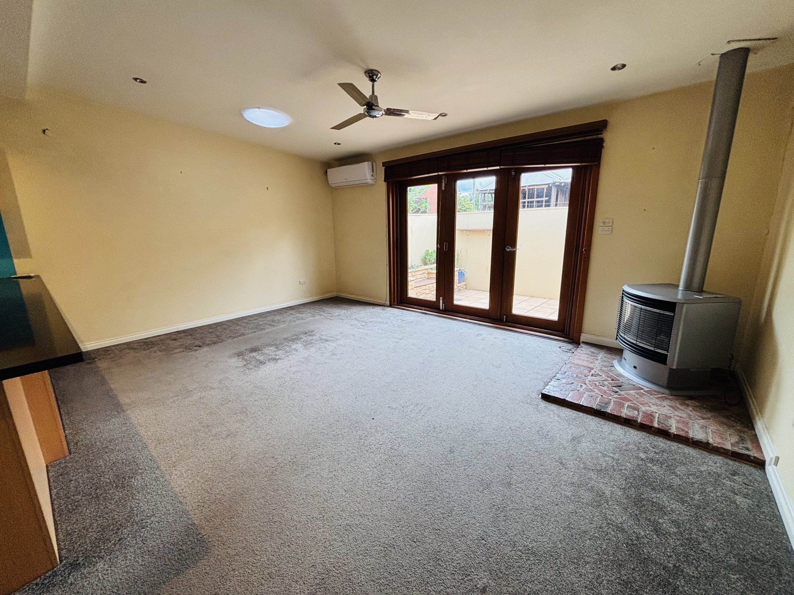 The generous kitchen features stainless steel appliances, gas cooking, a dishwasher, and ample cupboard space, flowing easily to a very large carpeted lounge that opens through bi-fold doors to a private courtyard — ideal for relaxed mornings or entertaining friends. A stylish modern bathroom with freestanding bath seperate shower built-in laundry, and thoughtful updates throughout complement the home’s heritage details such as timber floors and stained-glass accents. Heating and cooling provide year-round comfort.